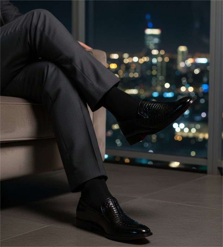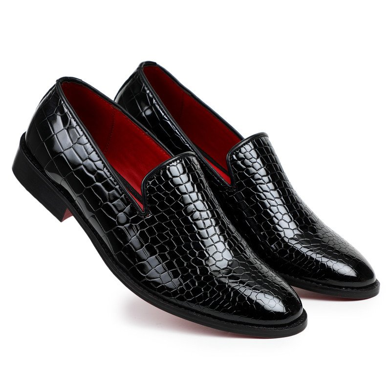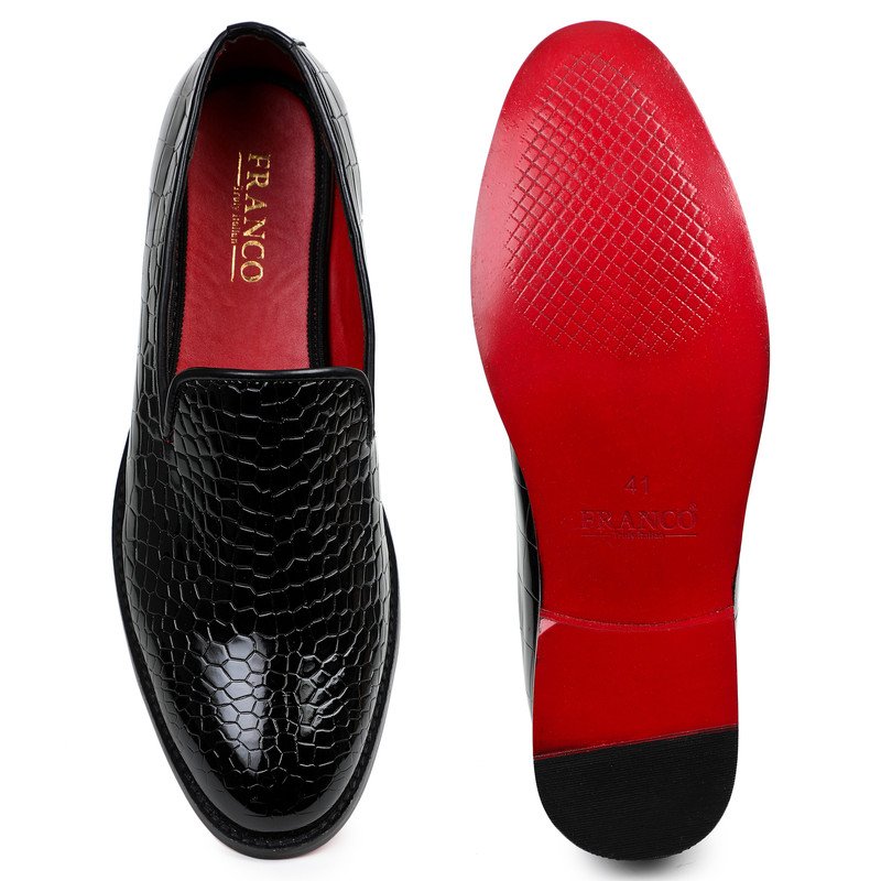 patent leather smoking slipper featuring an all-over crocodile-embossed texture and a bold red interior lining.