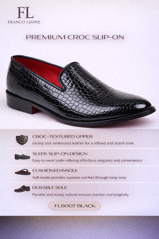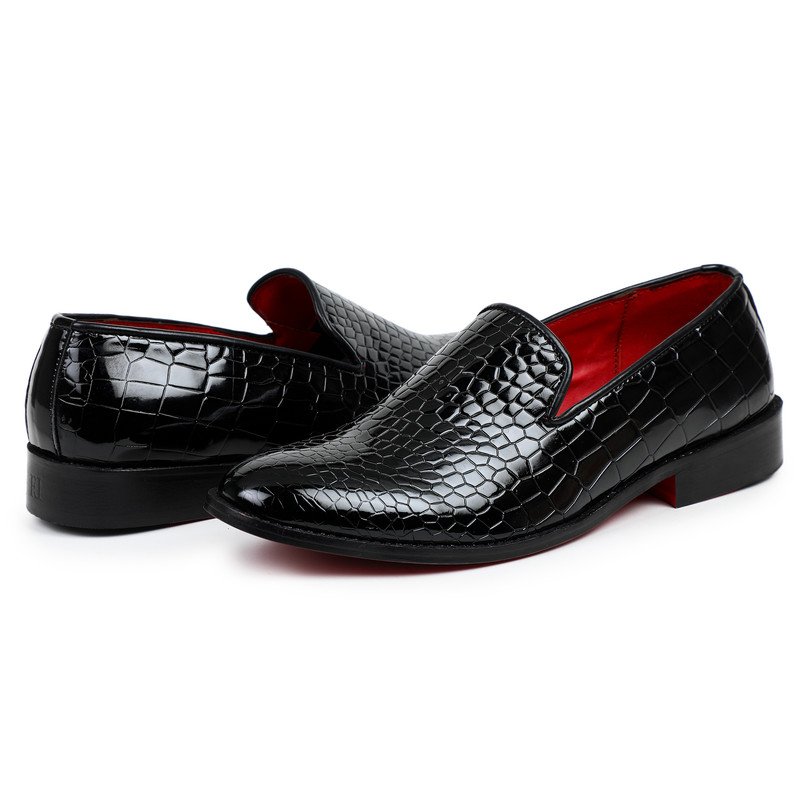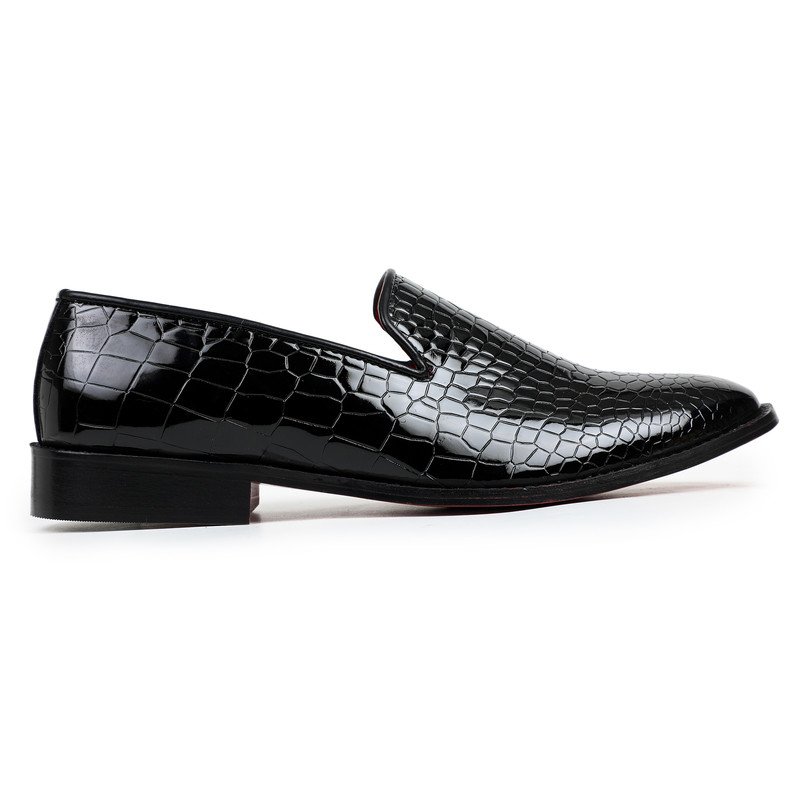 Black patent leather smoking slipper featuring an all-over crocodile-embossed texture and a bold red interior lining.